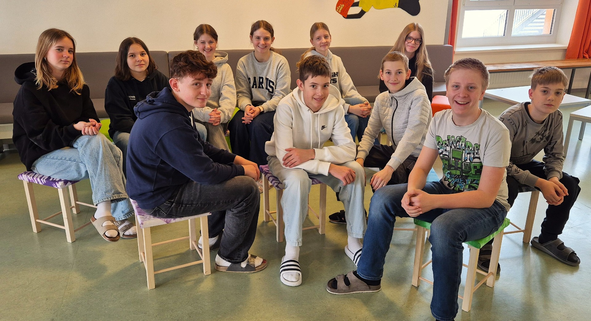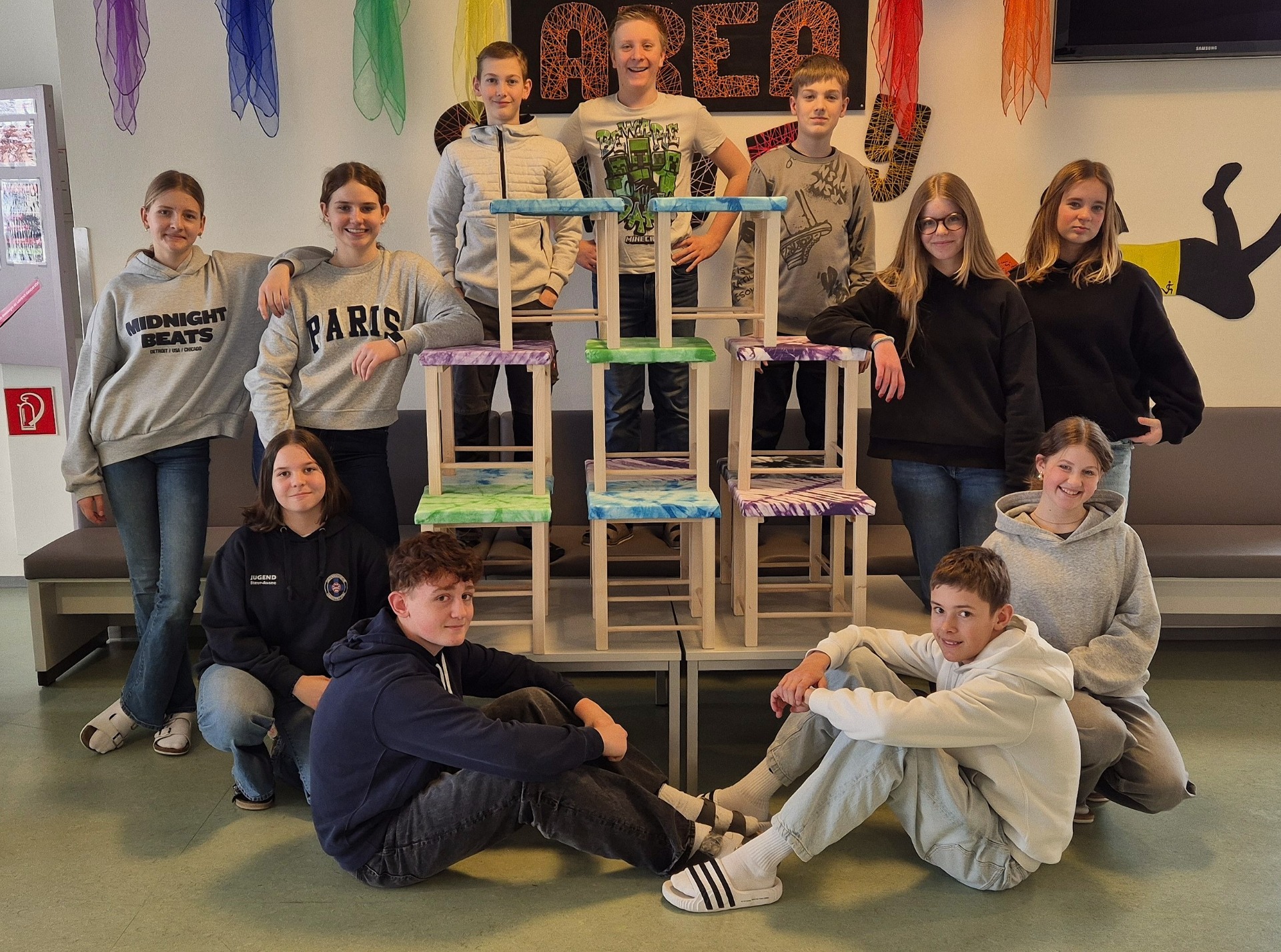Am Ende konnten alle stolz ihr Werkstück präsentieren Jeder Hocker ist ein Unikat und wurde natürlich gleich auf Stabilität und Komfort getestet!